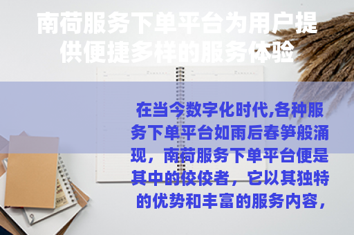 需注意的是,由于不清楚南荷服务下单平台的具体情况,以上内容为根据一般服务下单平台的特点和优势进行的创作,您可根据实际情况对内容进行调整和修改。
