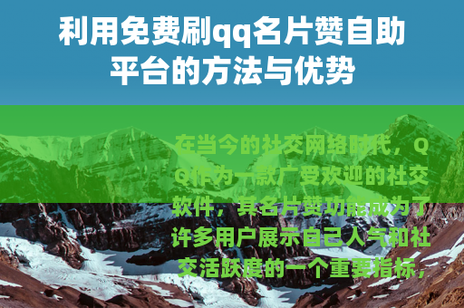 在当今的社交网络时代,QQ作为一款广受欢迎的社交软件,其名片赞功能成为了许多用户展示自己人气和社交活跃度的一个重要指标,而免费刷qq名片赞自助平台的出现,为广大QQ用户提供了一种快速增加名片赞数量的途径,并且具有诸多优势和值得探讨的地方。