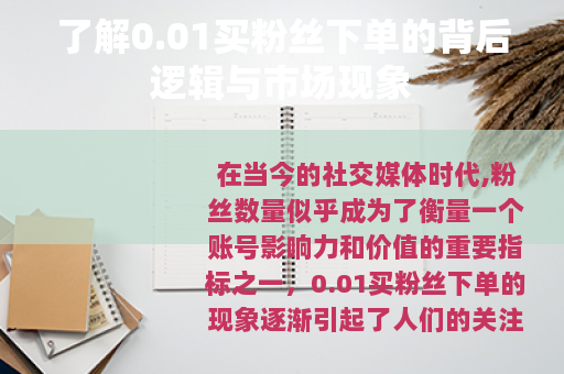 在当今的社交媒体时代,粉丝数量似乎成为了衡量一个账号影响力和价值的重要指标之一,0.01买粉丝下单的现象逐渐引起了人们的关注。