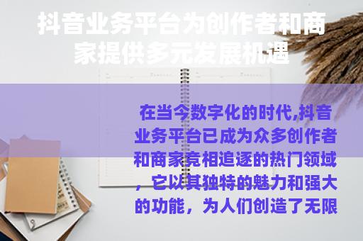 在当今数字化的时代,抖音业务平台已成为众多创作者和商家竞相追逐的热门领域,它以其独特的魅力和强大的功能,为人们创造了无限的可能,开启了一个全新的商业和创作纪元。