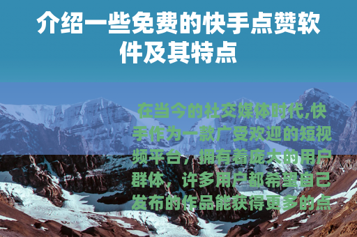 在当今的社交媒体时代,快手作为一款广受欢迎的短视频平台,拥有着庞大的用户群体,许多用户都希望自己发布的作品能获得更多的点赞,以增加作品的曝光度和人气,免费的快手点赞软件应运而生,为用户提供了一种提升点赞数的途径。