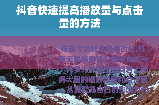 在当今的社交媒体时代,抖音无疑是最热门的平台之一,许多人都渴望在抖音上获得大量的播放数量和点击量,从而提升自己的影响力和知名度,抖音怎样才能快速提高播放数量和点击量呢?以下是一些实用的方法。 质量是关键,要确保你的视频具有独特性和吸引力,可以从自身的兴趣、特长出发,创作一些与众不同的内容,比如有趣的生活小窍门、精彩的才艺表演、感人的故事分享等等,只有当你的视频能够真正引起观众的兴趣,他们才会愿意花时间观看,并且有可能分享给更多的人,进而提高播放量和点击量。