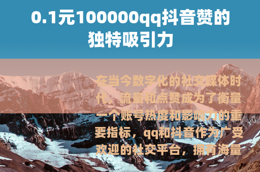 在当今数字化的社交媒体时代,流量和点赞成为了衡量一个账号热度和影响力的重要指标,qq和抖音作为广受欢迎的社交平台,拥有海量的用户群体,而有一种现象引起了众多用户的关注,那就是0.1元100000qq抖音赞的服务。