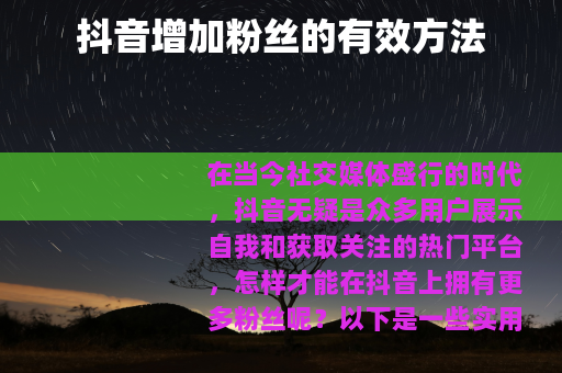 在当今社交媒体盛行的时代,抖音无疑是众多用户展示自我和获取关注的热门平台,怎样才能在抖音上拥有更多粉丝呢?以下是一些实用的方法。
