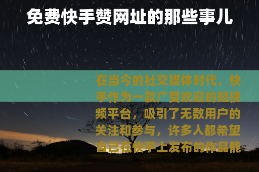 在当今的社交媒体时代,快手作为一款广受欢迎的短视频平台,吸引了无数用户的关注和参与,许多人都希望自己在快手上发布的作品能够获得更多的点赞,从而增加曝光度和人气,免费快手赞网址便应运而生,成为了一些用户关注的焦点。