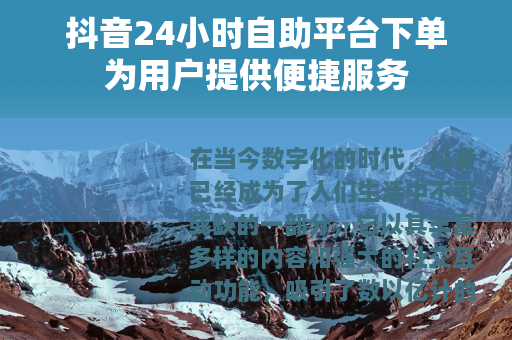 抖音24小时自助平台下单是一种创新的服务模式,它允许用户在任何时间、任何地点,通过简单的操作流程,轻松完成各种下单任务,无论是购买商品、预订服务,还是参与各种活动,用户都可以在这个平台上快速实现自己的需求。