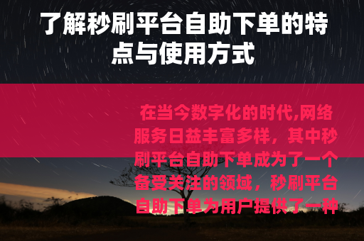 在当今数字化的时代,网络服务日益丰富多样,其中秒刷平台自助下单成为了一个备受关注的领域,秒刷平台自助下单为用户提供了一种便捷、高效的方式来获取各种所需的服务和数据增长。