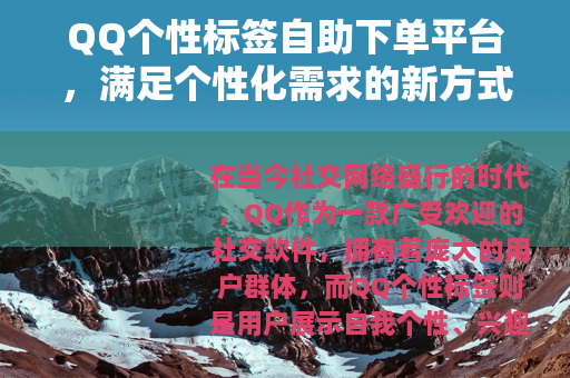在当今社交网络盛行的时代,QQ作为一款广受欢迎的社交软件,拥有着庞大的用户群体,而QQ个性标签则是用户展示自我个性、兴趣爱好和态度的重要方式之一,随着互联网技术的不断发展,QQ个性标签自助下单平台应运而生,为用户提供了一种便捷、高效的方式来定制自己独特的个性标签。