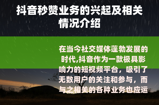 在当今社交媒体蓬勃发展的时代,抖音作为一款极具影响力的短视频平台,吸引了无数用户的关注和参与,而与之相关的各种业务也应运而生,其中抖音秒赞业务便是近年来受到不少人关注的一种。
