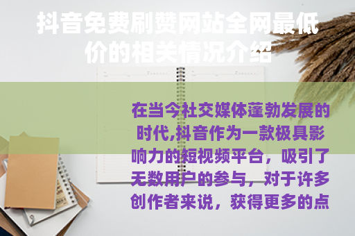 在当今社交媒体蓬勃发展的时代,抖音作为一款极具影响力的短视频平台,吸引了无数用户的参与,对于许多创作者来说,获得更多的点赞是他们追求的目标之一,这不仅能带来成就感,还可能在一定程度上增加账号的曝光度和影响力,抖音免费刷赞网站全网最低价这样的信息便在一些网络角落中流传开来。
