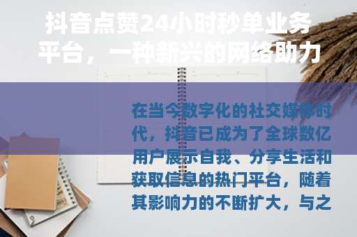 在当今数字化的社交媒体时代,抖音已成为了全球数亿用户展示自我、分享生活和获取信息的热门平台,随着其影响力的不断扩大,与之相关的各种业务也应运而生,其中就包括抖音点赞24小时秒单业务平台。