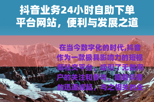 在当今数字化的时代,抖音作为一款极具影响力的短视频社交平台,吸引了无数用户的关注和参与,随着抖音的迅速崛起,与之相关的业务需求也日益增长,抖音业务24小时自助下单平台网站应运而生,为用户提供了一种全新的、便捷的服务模式。