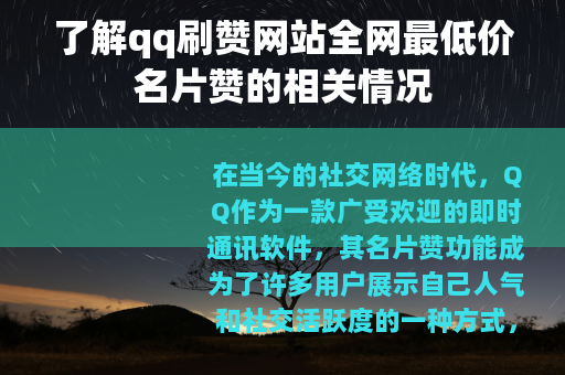 在当今的社交网络时代,QQ作为一款广受欢迎的即时通讯软件,其名片赞功能成为了许多用户展示自己人气和社交活跃度的一种方式,而在网络上,出现了众多宣称提供全网最低价名片赞的QQ刷赞网站,这一现象引起了不少人的关注。