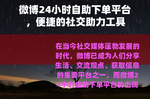 在当今社交媒体蓬勃发展的时代,微博已成为人们分享生活、交流观点、获取信息的重要平台之一,而微博24小时自助下单平台的出现,更是为用户提供了一种全新的便捷体验。