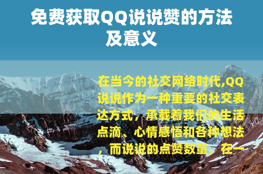 在当今的社交网络时代,QQ说说作为一种重要的社交表达方式,承载着我们的生活点滴、心情感悟和各种想法,而说说的点赞数量,在一定程度上也反映了其受欢迎程度和影响力,免费获得QQ说说赞成为了许多人关注的话题,今天我们就来聊聊关于免费获取QQ说说赞20个的那些事儿。