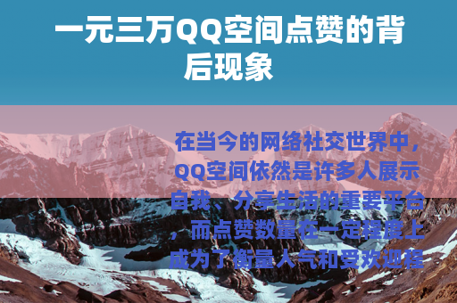 在当今的网络社交世界中,QQ空间依然是许多人展示自我、分享生活的重要平台,而点赞数量在一定程度上成为了衡量人气和受欢迎程度的一个指标,近年来,出现了一种一元三万QQ空间点赞的现象,引起了不少人的关注。