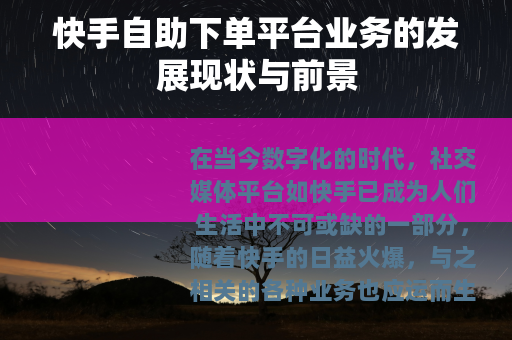 在当今数字化的时代,社交媒体平台如快手已成为人们生活中不可或缺的一部分,随着快手的日益火爆,与之相关的各种业务也应运而生,其中快手自助下单平台业务备受关注。