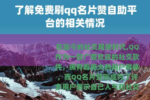 在当今的社交网络时代,QQ作为一款广受欢迎的社交软件,拥有着庞大的用户群体,而QQ名片赞则成为了许多用户展示自己人气和社交活跃度的一个重要指标,免费刷qq名片赞自助平台便应运而生,吸引了众多QQ用户的关注。