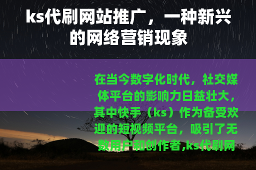 在当今数字化时代,社交媒体平台的影响力日益壮大,其中快手(ks)作为备受欢迎的短视频平台,吸引了无数用户和创作者,ks代刷网站推广也逐渐成为了一个备受关注的话题。
