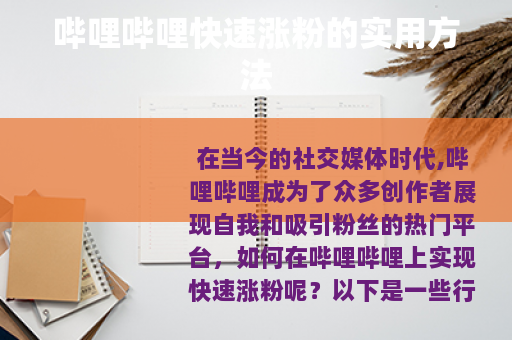 要在哔哩哔哩上快速涨粉,需要从内容创作、更新频率、标题封面优化、互动以及利用平台功能等多方面入手,持续努力和不断改进,才能吸引越来越多的粉丝关注,在B站这个充满活力的平台上取得成功。