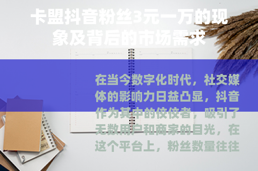 在当今数字化时代,社交媒体的影响力日益凸显,抖音作为其中的佼佼者,吸引了无数用户和商家的目光,在这个平台上,粉丝数量往往被视为一种重要的资产,它不仅代表着个人或品牌的受欢迎程度,还可能与商业价值紧密相连,而“卡盟抖音粉丝3元一万”的现象也随之悄然兴起。