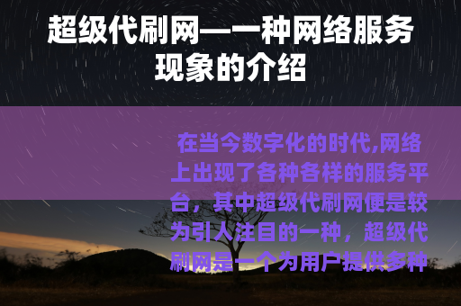 在当今数字化的时代,网络上出现了各种各样的服务平台,其中超级代刷网便是较为引人注目的一种,超级代刷网是一个为用户提供多种代刷服务的在线平台,它涵盖了众多领域,满足了不同用户的需求。