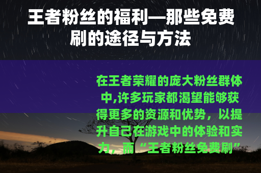 在王者荣耀的庞大粉丝群体中,许多玩家都渴望能够获得更多的资源和优势,以提升自己在游戏中的体验和实力,而“王者粉丝免费刷”的话题也因此备受关注,今天我们就来聊一聊一些常见的王者粉丝免费刷的方式及其背后的原理。