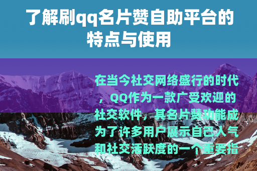 在当今社交网络盛行的时代,QQ作为一款广受欢迎的社交软件,其名片赞功能成为了许多用户展示自己人气和社交活跃度的一个重要指标,而刷qq名片赞自助平台也随之应运而生,为广大QQ用户提供了一种快速增加名片赞数量的途径。