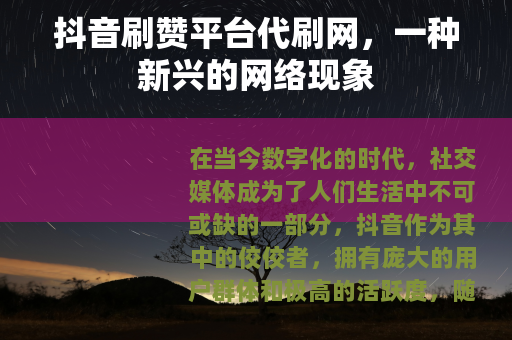 在当今数字化的时代,社交媒体成为了人们生活中不可或缺的一部分,抖音作为其中的佼佼者,拥有庞大的用户群体和极高的活跃度,随着抖音的火爆,与之相关的产业也应运而生,其中就包括抖音刷赞平台代刷网。