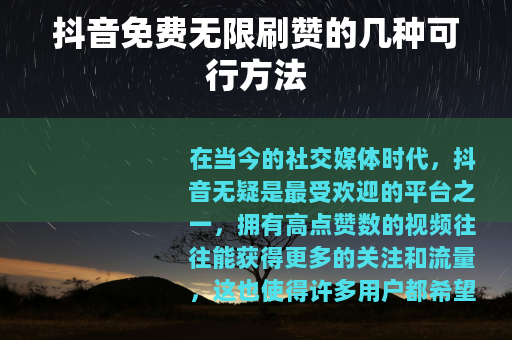 在当今的社交媒体时代,抖音无疑是最受欢迎的平台之一,拥有高点赞数的视频往往能获得更多的关注和流量,这也使得许多用户都希望自己的作品能有大量的点赞,而关于抖音免费无限刷赞,其实存在着一些有效的途径。 的优质是吸引点赞的基础,当你创作出有趣、有价值、富有创意的视频内容时,自然会引发观众的共鸣,从而促使他们点赞,你可以分享自己独特的生活经历,像一次难忘的旅行,将旅途中的美景、美食以及遇到的有趣故事通过视频展现出来,让观众仿佛身临其境,感受到其中的快乐与新奇,或者制作一些实用的生活小妙招视频,教大家如何轻松解决生活中的各种小问题,这样的内容具有很强的实用性,会吸引大量用户点赞并收藏,以便日后参考。
