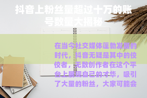 在当今社交媒体蓬勃发展的时代,抖音无疑是其中的佼佼者,无数创作者在这个平台上展现自己的才华,吸引了大量的粉丝,大家可能会好奇,在抖音这个庞大的生态系统中,究竟有多少个账号的粉丝量超过了十万呢?