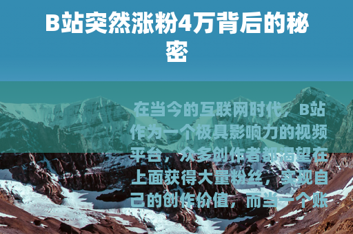 在当今的互联网时代,B站作为一个极具影响力的视频平台,众多创作者都渴望在上面获得大量粉丝,实现自己的创作价值,而当一个账号突然涨粉4万时,这无疑是一件令人兴奋且引人注目的事情。