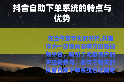 在当今数字化的时代,抖音作为一款极具影响力的短视频平台,吸引了无数用户的关注和参与,而与之相关的抖音自助下单系统也逐渐走进了人们的视野,为用户提供了更加便捷和多样化的服务。