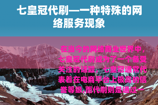 在当今的网络商业世界中,七皇冠代刷成为了一个备受关注的话题,七皇冠通常代表着在电商平台上极高的信誉等级,而代刷则是通过一些特定的手段来帮助商家快速提升店铺的信誉度和相关数据。
