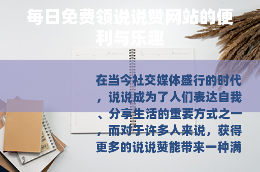 在当今社交媒体盛行的时代,说说成为了人们表达自我、分享生活的重要方式之一,而对于许多人来说,获得更多的说说赞能带来一种满足感和成就感,这时,每日免费领说说赞网站便应运而生,为广大用户提供了一个轻松获取赞的途径,增添了不少网络社交的乐趣。