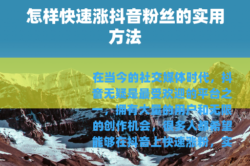 在当今的社交媒体时代,抖音无疑是最受欢迎的平台之一,拥有大量的用户和无限的创作机会,很多人都希望能够在抖音上快速涨粉,实现自己的影响力和价值,以下是一些可以帮助你快速涨抖音粉丝的有效方法。