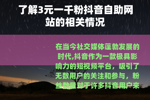 在当今社交媒体蓬勃发展的时代,抖音作为一款极具影响力的短视频平台,吸引了无数用户的关注和参与,粉丝数量对于许多抖音用户来说是一个重要的指标,它不仅代表着个人或账号的受欢迎程度,还可能与商业机会等息息相关,在这样的背景下,3元一千粉抖音自助网站应运而生,成为了一些人关注的焦点。