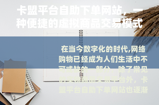 在当今数字化的时代,网络购物已经成为人们生活中不可或缺的一部分,除了常见的实物商品交易平台外,卡盟平台自助下单网站也逐渐崭露头角,为用户提供了一种全新的虚拟商品交易体验。