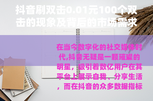 在当今数字化的社交媒体时代,抖音无疑是一颗璀璨的明星,吸引着数亿用户在其平台上展示自我、分享生活,而在抖音的众多数据指标中,双击量即点赞数成为了衡量一个视频受欢迎程度的重要标志之一,一种奇特的现象应运而生——抖音刷双击服务,其中以0.01元100个双击的价格尤为引人注目。