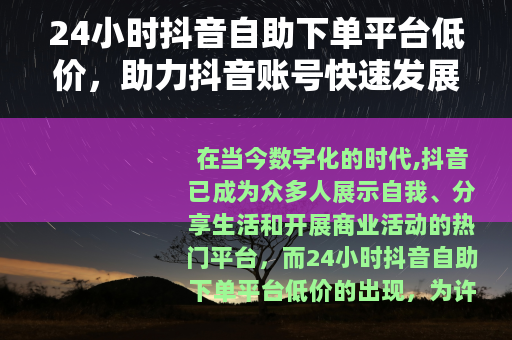 在当今数字化的时代,抖音已成为众多人展示自我、分享生活和开展商业活动的热门平台,而24小时抖音自助下单平台低价的出现,为许多抖音用户提供了一种新的助力方式。
