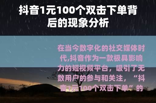 在当今数字化的社交媒体时代,抖音作为一款极具影响力的短视频平台,吸引了无数用户的参与和关注。“抖音1元100个双击下单”的现象逐渐进入了人们的视野。