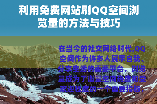 通过免费网站刷QQ空间浏览量是一种可以尝试的方法,但要注意选择合适的网站,掌握正确的技巧,并且保持理性和正确的心态,也要不断努力提升自己空间的内容质量和互动性,这样才能让自己的QQ空间真正获得更多的关注和喜爱,成为自己在网络世界中展示自我、结交朋友的理想平台,在这个过程中,我们要充分享受社交网络带来的乐趣,用积极的方式去经营和发展自己的QQ空间,让它为我们的生活增添更多的色彩和意义。