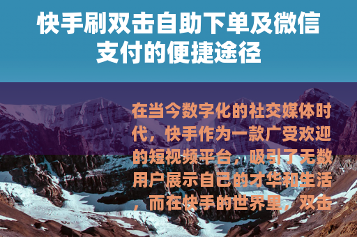 在当今数字化的社交媒体时代,快手作为一款广受欢迎的短视频平台,吸引了无数用户展示自己的才华和生活,而在快手的世界里,双击点赞成为了衡量一个作品受欢迎程度的重要指标之一,为了获得更多的双击,一些用户开始寻找刷双击的自助下单服务,并且微信支付的便捷性也使得这一过程变得更加容易。