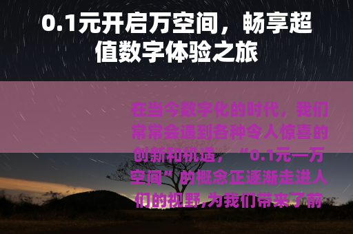 在当今数字化的时代,我们常常会遇到各种令人惊喜的创新和机遇。“0.1元—万空间”的概念正逐渐走进人们的视野,为我们带来了前所未有的体验和可能。