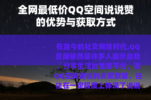 在当今的社交网络时代,QQ空间依然是许多人展示自我、分享生活的重要平台,而QQ空间说说的点赞数量,往往在一定程度上体现了说说的受欢迎程度和影响力,全网最低价QQ空间说说赞成为了不少人关注的焦点。