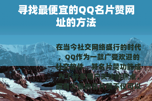 寻找最便宜的QQ名片赞网址需要我们多方面的考虑和努力,通过合理的比较、选择以及关注优惠活动等方式,我们可以在保证服务质量的前提下,以较低的价格获得足够的QQ名片赞,从而让自己的QQ名片更加出彩,在社交网络中展现出更高的人气。