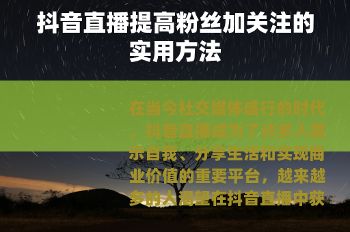 在当今社交媒体盛行的时代,抖音直播成为了许多人展示自我、分享生活和实现商业价值的重要平台,越来越多的人渴望在抖音直播中获得更多的粉丝和关注,从而扩大自己的影响力,抖音直播怎么提高粉丝加关注呢?以下是一些实用的方法。