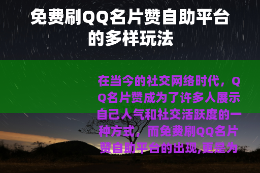 在当今的社交网络时代,QQ名片赞成为了许多人展示自己人气和社交活跃度的一种方式,而免费刷QQ名片赞自助平台的出现,更是为广大QQ用户提供了一种独特的体验。