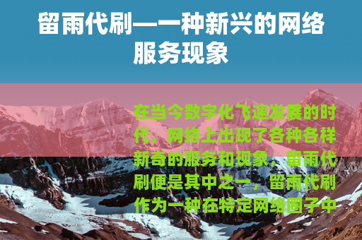 在当今数字化飞速发展的时代,网络上出现了各种各样新奇的服务和现象,留雨代刷便是其中之一,留雨代刷作为一种在特定网络圈子中逐渐兴起的服务,吸引了不少人的关注。