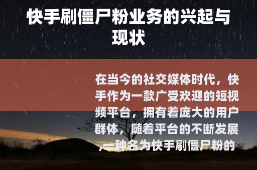 在当今的社交媒体时代,快手作为一款广受欢迎的短视频平台,拥有着庞大的用户群体,随着平台的不断发展,一种名为快手刷僵尸粉的业务也悄然兴起。